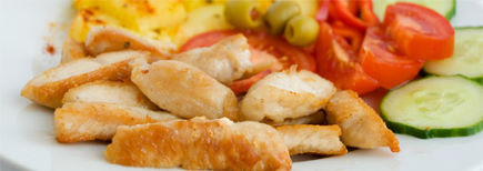 Hühnerfleisch, Cheddar Cheese, Salat, Tomaten, Zwiebeln, Spezial-Sauce, Pommes